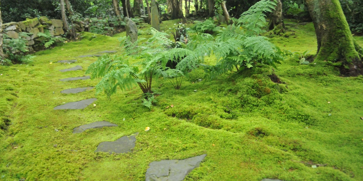 In my brother’s garden in Ireland the wooded areas around his wonderful garden (Greba Gardens, Greyabbey, Northern Ireland) are densely shaded and poorly draining, plus, the Irish weather keeps the areas damp. He has cleared the areas of weeds and left the moss to grow over the thin soil and over trees and walls. The moss has a sound deadening effect giving an ethereal sensation where one expects to see wood nymphs dancing in the twilight.