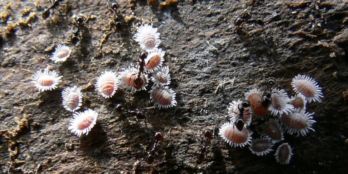 - Farming Ants - Many ant species including pest species in New Zealand ‘farm’ sap-sucking insects such as aphids, scale insects and mealybugs (see the image above of ants tending their 'herd' of mealy bugs). They protect the sap-sucking insects from predators and are rewarded by feeding on the sweet sugary honeydew the sap-sucking insects produce.