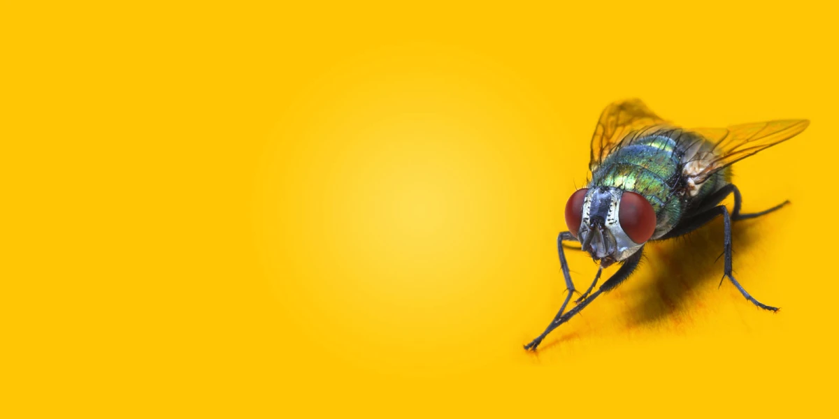 The most common pest flies in homes. Adult house flies are 8-12 mm long. Their thorax is grey or sometimes black, with four longitudinal dark lines on the back. Eyes are usually dark red.