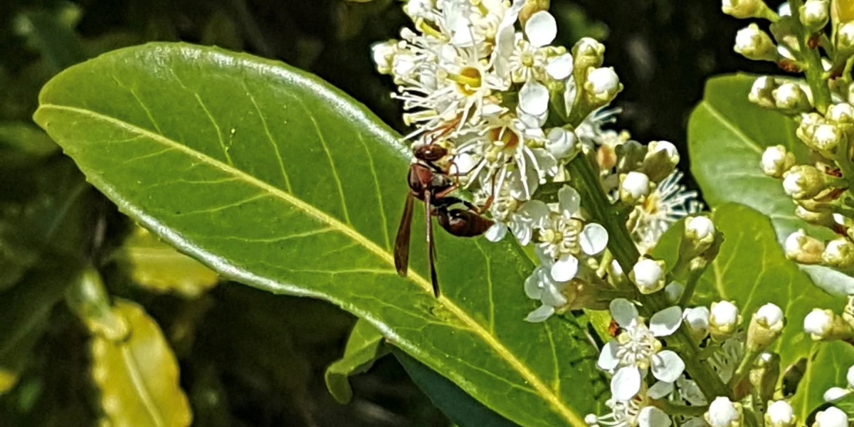 The black and yellow striped Asian paper wasp Polistes chinensis, arrived in New Zealand in the late 1970s. They settled into the suburbs of Auckland and are now responsible for most wasp stings that result in visits to the doctor. More recently the European paper wasp has been found in New Zealand, first identifications were in the upper North Island. It is very similar looking to the Asian species. The Australian (sometimes called the Tasmanian) paper wasp Polistes tasmaniensis humilis, resembles the Asian and European paper wasps in shape but it is black and red-brown, with yellowish legs (see above). It has been part of the bush and garden scene of northern New Zealand for over 100 years. The paper wasps have a more obvious narrow waist than the German and common wasps and longer narrower bodies.