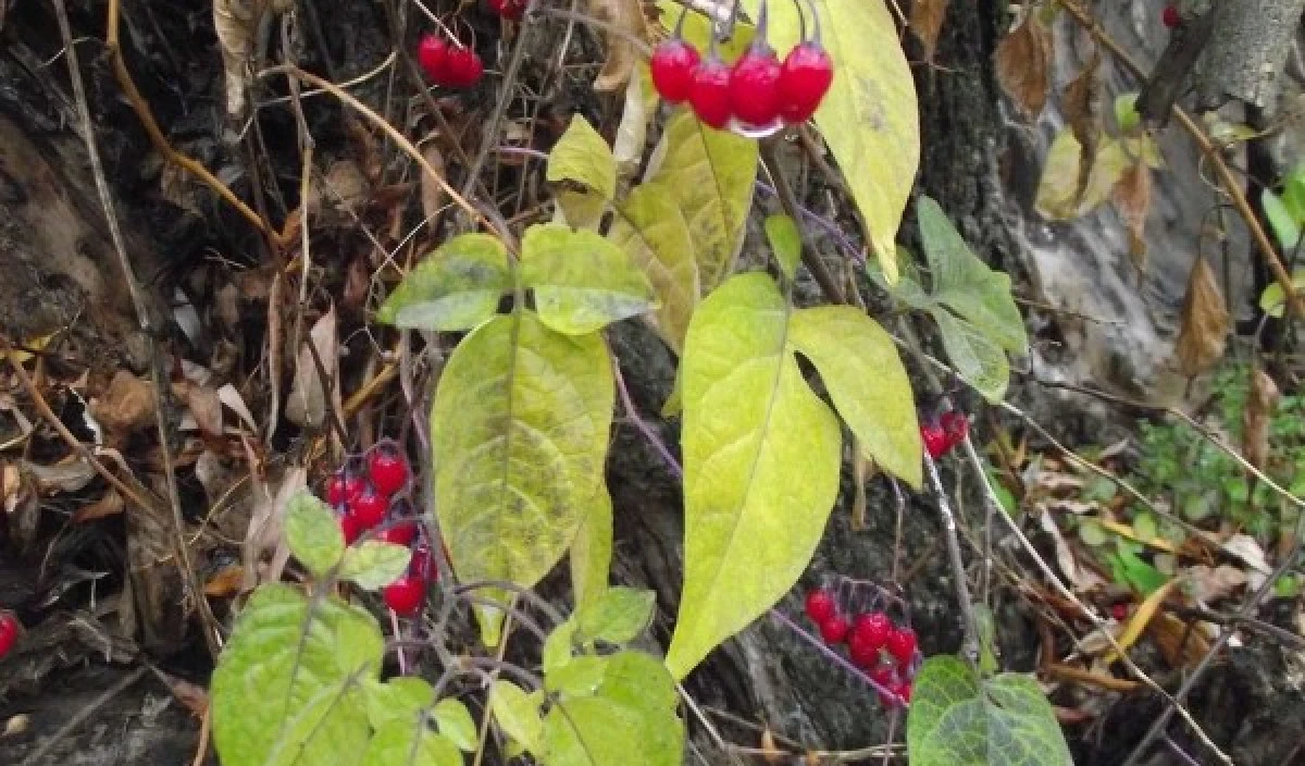 Bittersweet is a poisonous vine-like perennial growing up to 2 metres tall which produces berries which start green and become bright red.