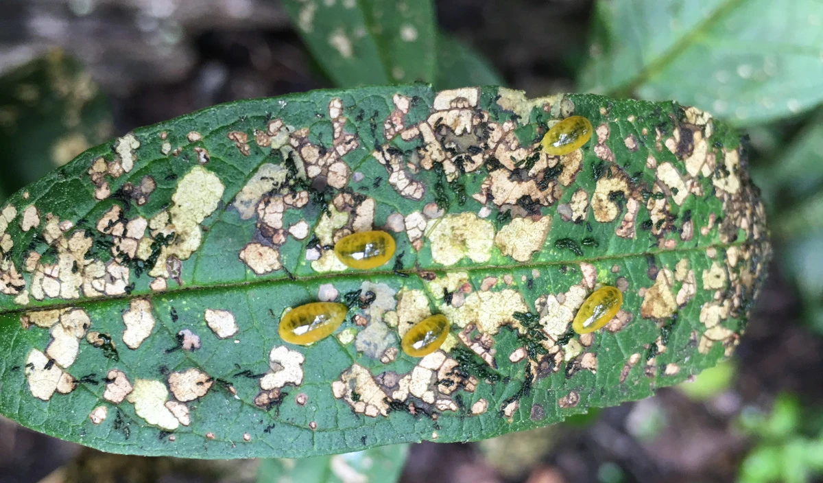 Larvae are slimy oval yellow/green grubs and the adults are typical weevils. Both adults and larvae remove the upper surface of the leaf, leaving the lower silvery surface intact. Adult feeding damage often forms a ragged hole in the Buddleia leaf. Leaves with significant damage become silvery-brown, curl and fall.