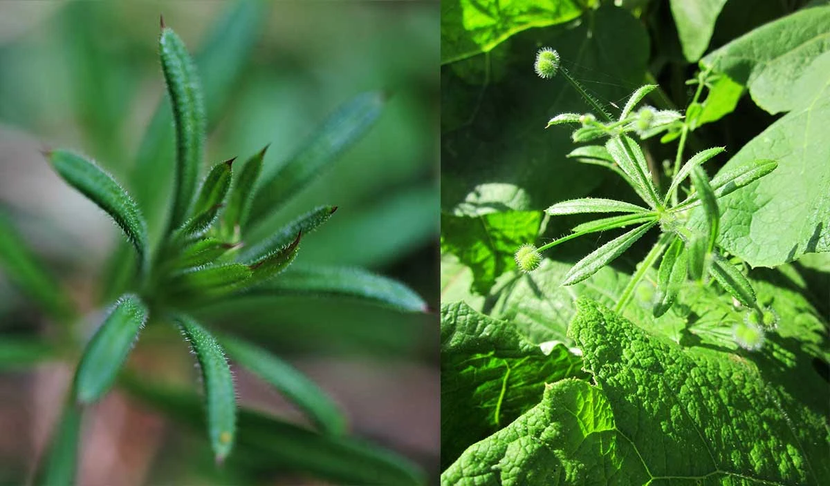 Cleavers is a common annual weed found in gardens. The leaves, stems and fruit 'stick' to clothing.