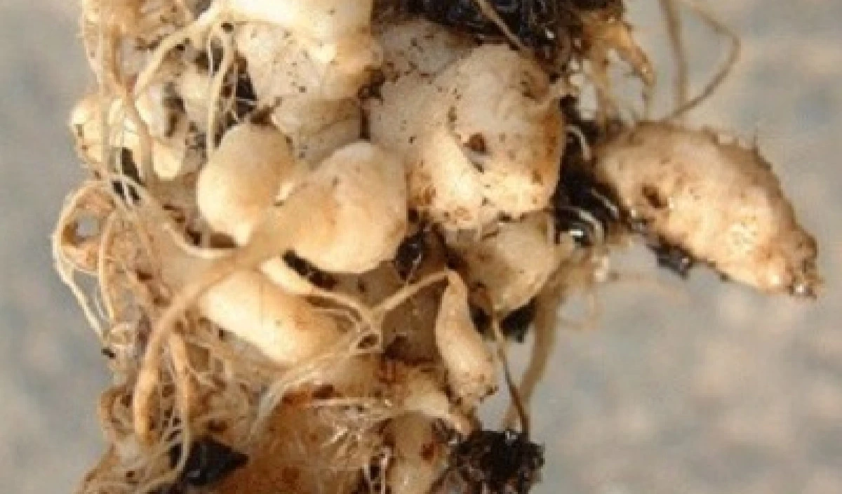 Above ground affected plant will have stunted growth, purplish foliage and wilting in hot weather, which may recover in wet conditions. Underground the root system becomes swollen and distorted, with a loss of fine roots. Growth and yield are greatly reduced and badly affected plants may die.