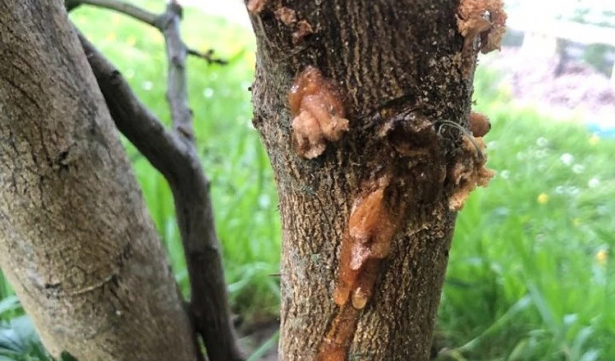 Gummosis is the symptom of several diseases and insect damage. Sticky sap oozes from trunks and branches.