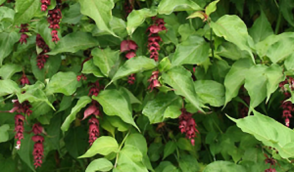 Honeysuckle vines are vigorous climbers with wiry stems that twine around shrubs and trees. They produce white/yellow flowers. Himalayan honeysuckle is a large perennial shrub with many stems and drooping deep red flowers.