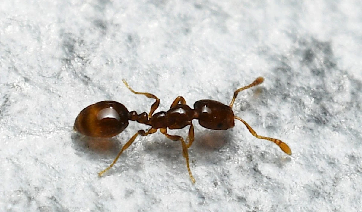 Pharaoh's ants are tiny (1.5-2.5 mm), brown ants that form large colonies, often within buildings. They are generalist feeders and have been known to infest hospitals and even feed in wounds. They may gnaw through packaging to gain access to food in kitchens.