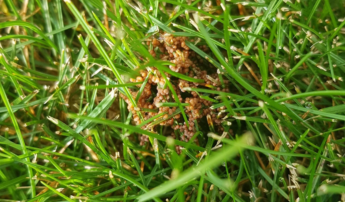 Slime moulds occasionally appear on lawns or plants as egg or crystal like growths on grass blades, stems or leaves. They can be of various colours; white, yellow, orange, grey and others. Slime moulds tend to appear in wet conditions or shaded areas of lawns. Slime moulds may cause concern but rarely do any harm to the grass or plants. Only if the area of mould becomes extensive will it damage the grass or plant by shading it from light.